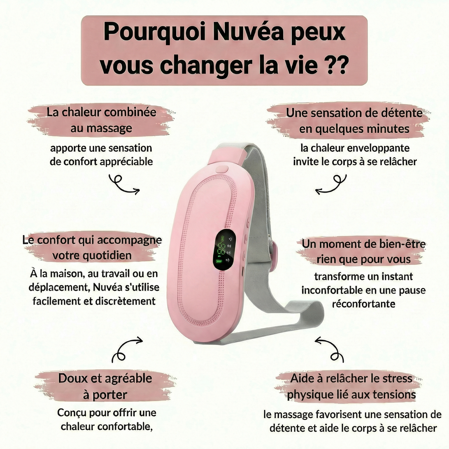 Nuvéa a été conçue pour apporter une sensation de chaleur ciblée et enveloppante, qui peut aider à relâcher les tensions et à améliorer le confort.